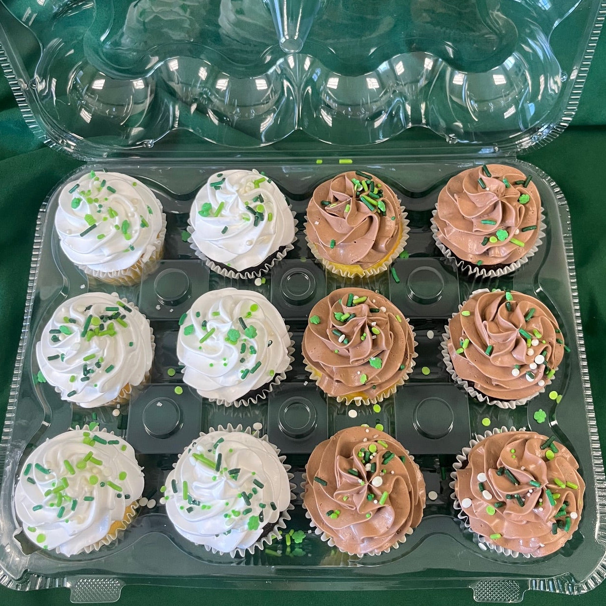 Have some fun with these tasty St. Patrick's Day themed cupcakes! One dozen (12) cupcakes, six (6) yellow and six (6) chocolate, topped with delicious creamy whipped frosting.